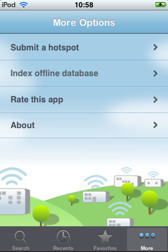 Het scherm binnen Wi-Fi Finder bestaat in de online-modus uit 3 knoppen. Hier zoek je naar hotspots in de buurt, zoek je openbare wifi-punten en download/update je de database. Terugkeren naar het hoofdscherm is vanuit deze drie opties niet mogelijk. Dit is echter niet de grootste manco van de software. Zonder verbinding een 'live' hotspot vinden is niet mogelijk. Je hebt zelfs een behoorlijk rappe verbinding nodig om hotspots te zien op een kaart.